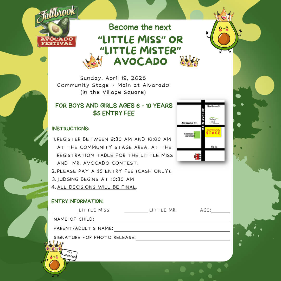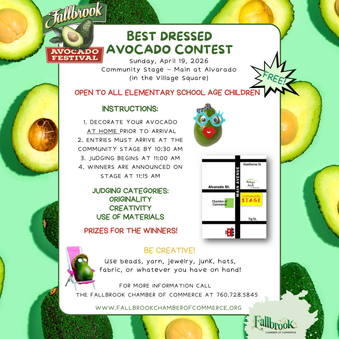 The Annual Avocado Festival benefits the community of Fallbrook in many more ways than people realize. It celebrates our agricultural heritage while providing an opportunity for entertainment and camaraderie; it brings large numbers of visitors to our town who will one day return to shop, to sightsee, and spend some time here; it provides significant economic benefits to our local businesses and community groups; and it generates enormous exposure of our community, both locally and regionally, through the broad advertising and promotional activities that accompany the Festival.